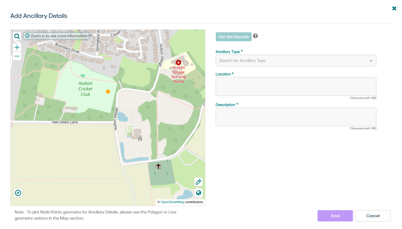 On Clicking (+) icon in the Ancillary Details section, will open a Modal window to fill the details and save the Ancillary. Draw the area in the map and click on the 'Get Site Records' button to get the Sites in the plotted region. Fill the details and save.
